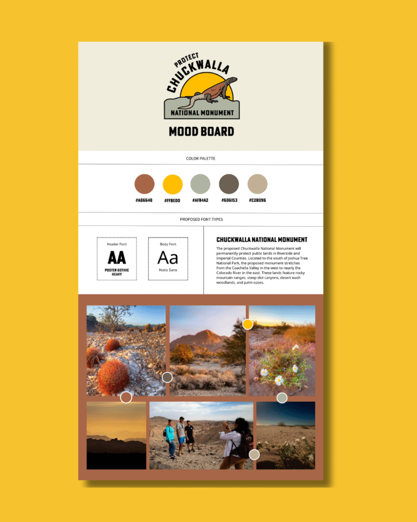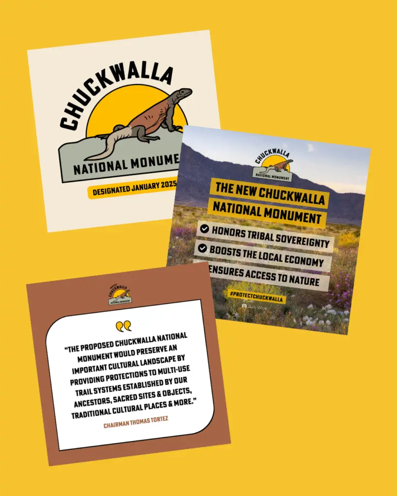 I led the visual identity for the Chuckwalla National Monument campaign, conceptualizing and designing a cohesive brand system to support advocacy, public education, and engagement. The work included developing the logo and visual language, designing the campaign website, creating social media graphics, and producing branded merchandise.