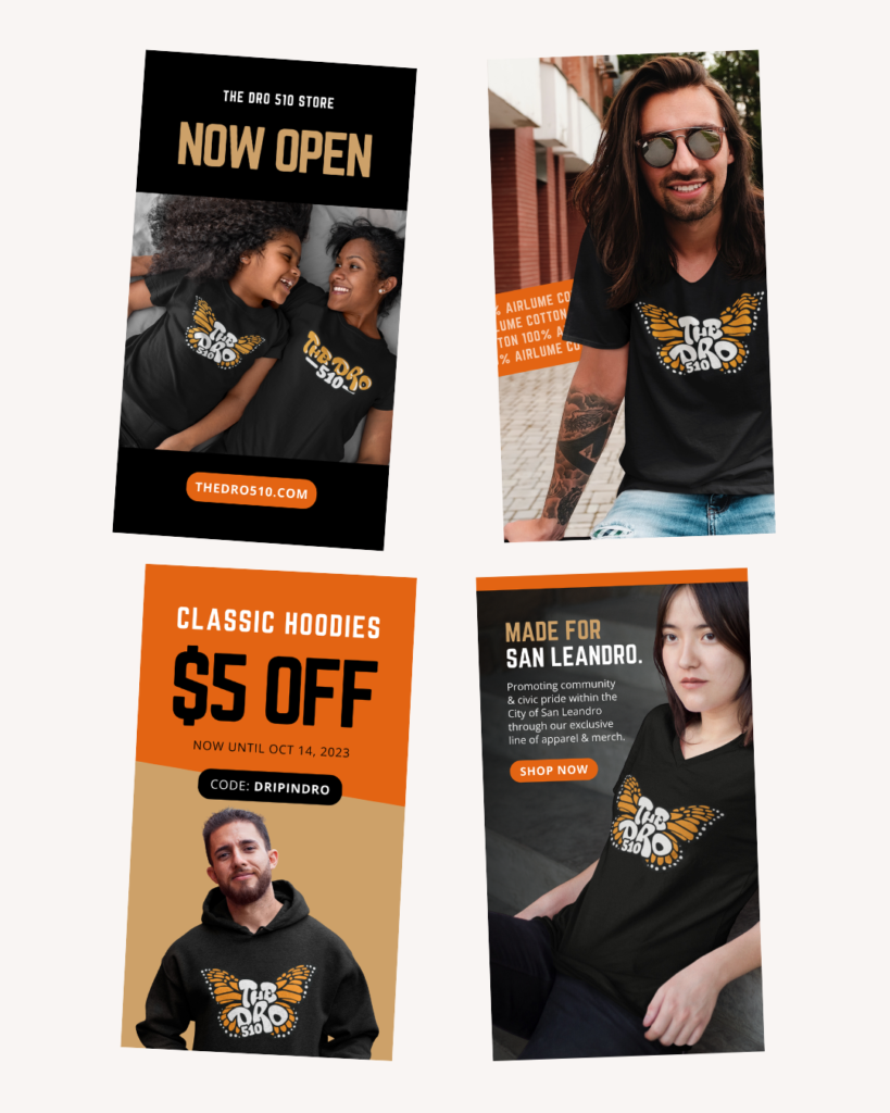 I partnered with The Dro 510, a San Leandro–based e-commerce brand, to help bring their community-driven mission to life through branding, marketing, and digital design. My work focused on developing brand concepts and visual direction that celebrated local pride and the unique spirit of “The Dro,” while supporting marketing and social media efforts to build awareness and connection with the community.