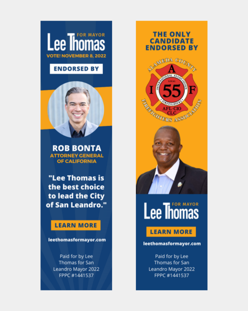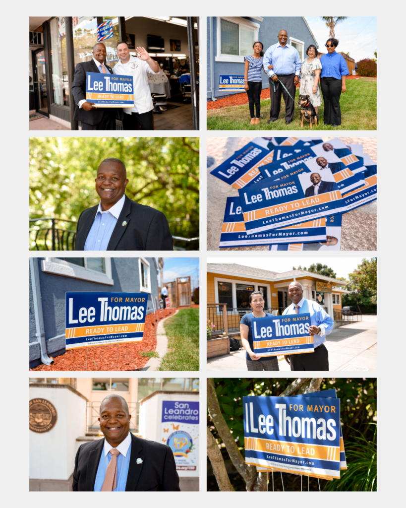 I supported the Lee Thomas for San Leandro Mayor campaign as the campaign photographer and graphic designer, helping shape a cohesive visual identity across print and digital platforms. My work focused on creating clear, approachable, and community-centered visuals that reflected the candidate’s values and resonated with San Leandro voters.