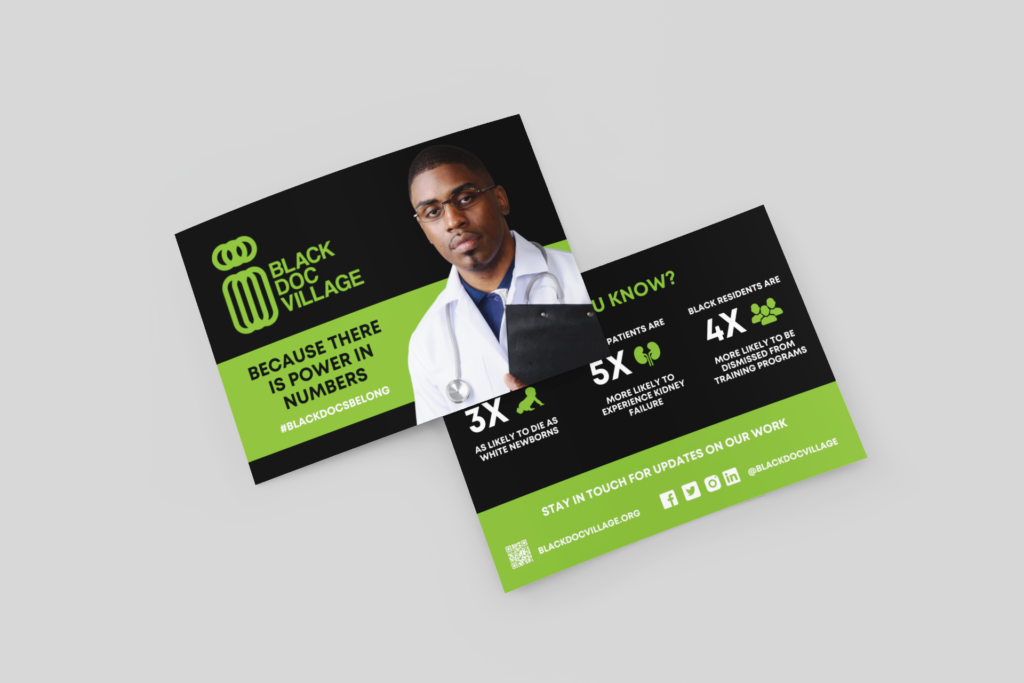 Black Doc Village needed a cohesive set of promotional materials to use across conferences, meetings, and community events. My work included designing postcards and flyers, mocking up branded merchandise, and creating a standing banner to support in-person outreach and visibility. The goal was to translate the organization’s mission into clear, compelling visuals that could stand out in busy, real-world environments while remaining flexible across formats. The resulting collateral helped Black Doc Village present a polished, consistent brand presence while engaging audiences and supporters on the ground.